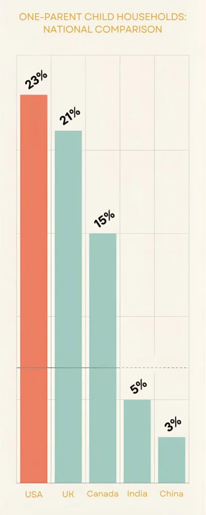 And the US sits at a striking position globally. Pew Research Center’s analysis of 130 countries found that 23% of American children live with one parent and no other adults — more than three times the global average of 7%. For context, that figure is 3% in China, 5% in India, 15% in Canada, and 21% in the UK.